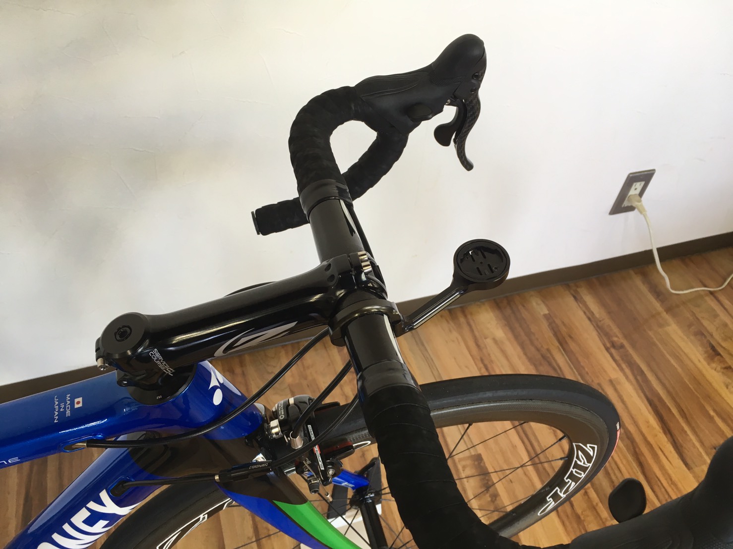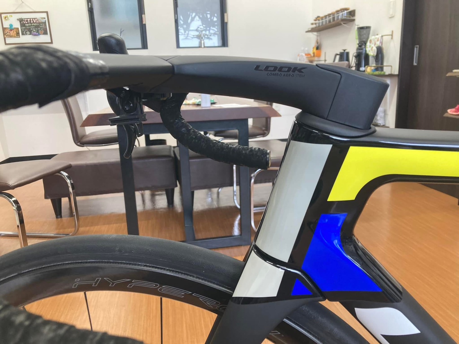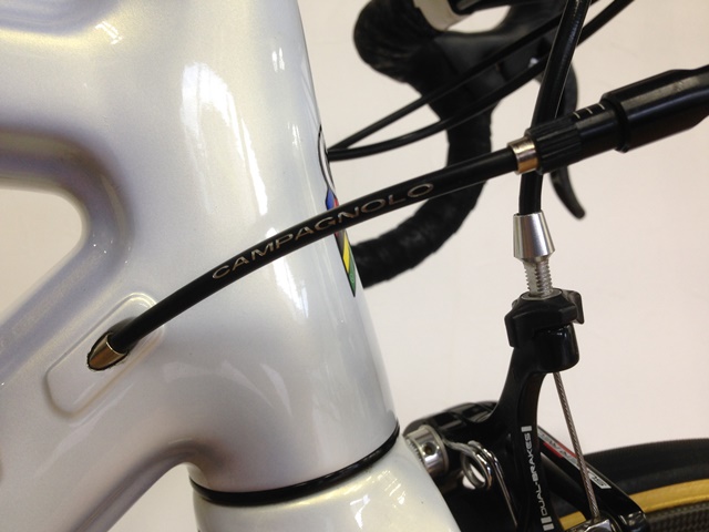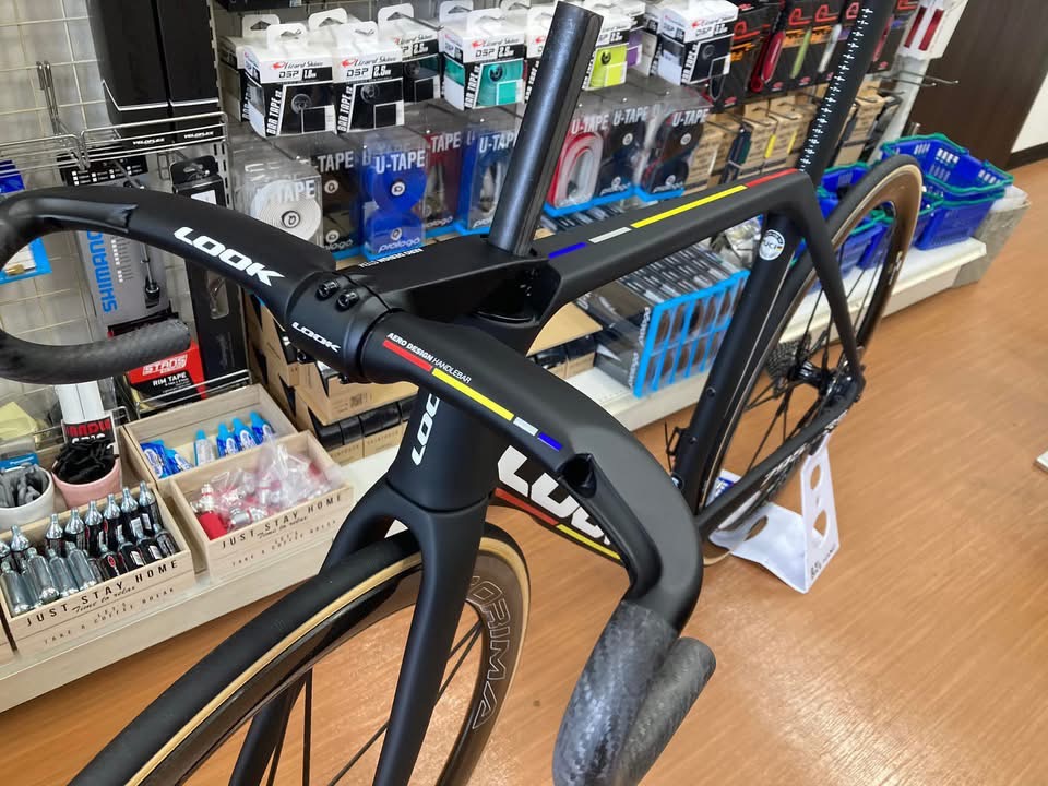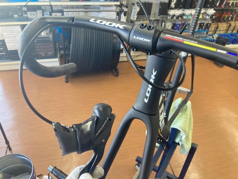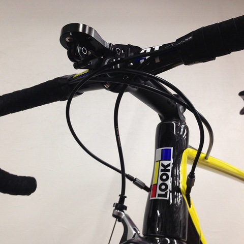 ルックで揃えられるところはルックで、カンパニョーロで揃えられるところはカンパニョーロをそれぞれ選択し、ルックのハンドルは油圧ブレーキ用ホースには非対応なので、そこだけ加工しています。