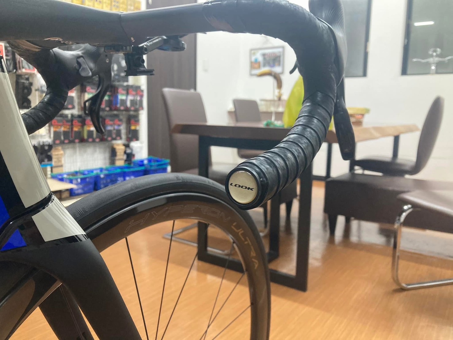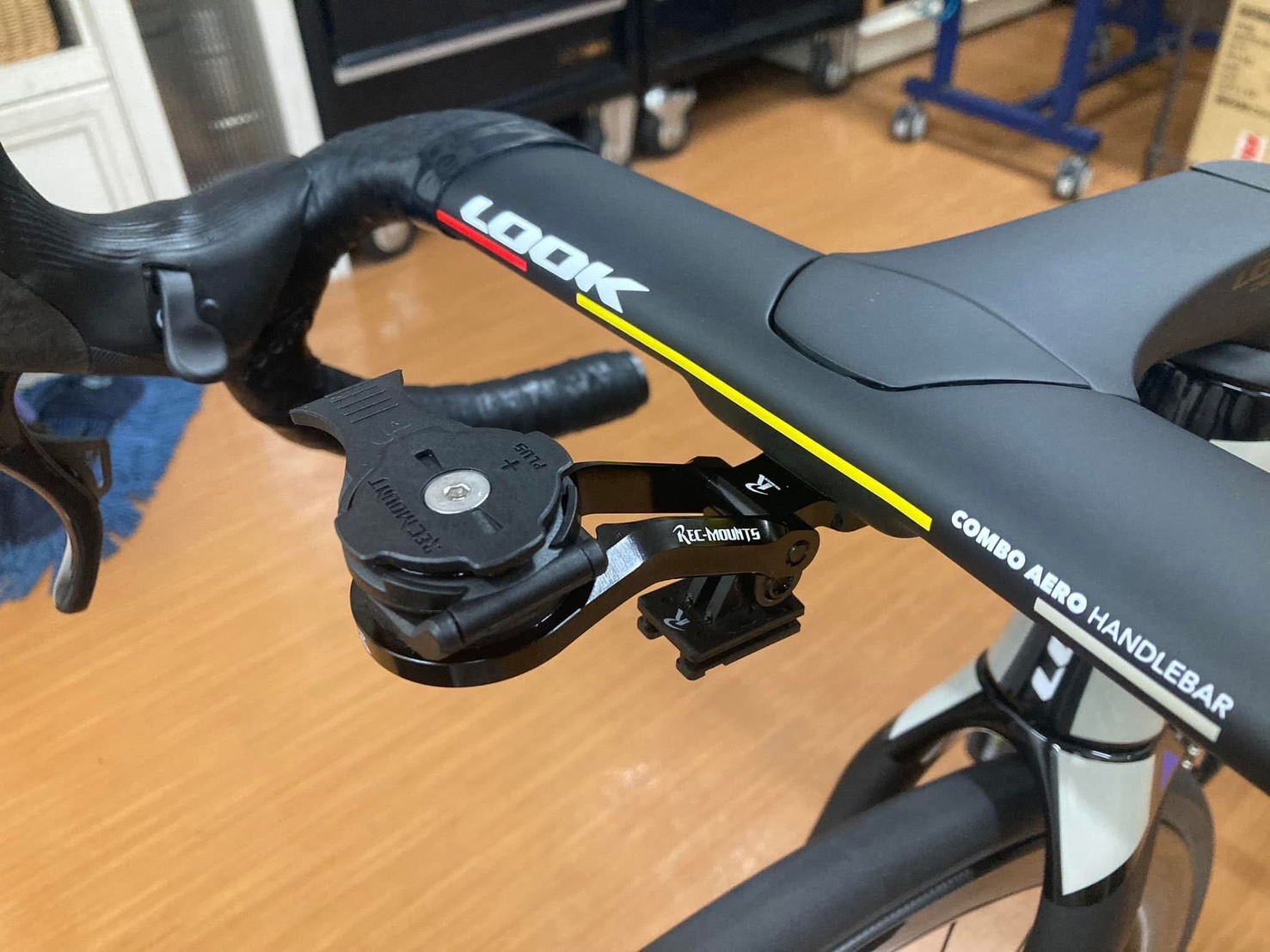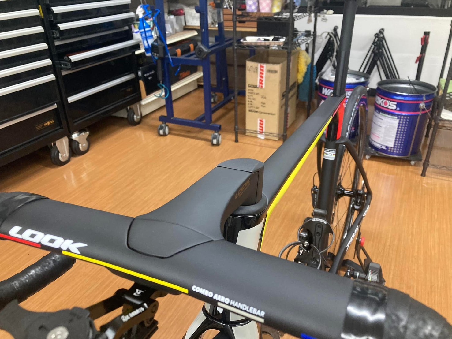 ルックで揃えられるところはルックで、カンパニョーロで揃えられるところはカンパニョーロをそれぞれ選択し、ルックのハンドルは油圧ブレーキ用ホースには非対応なので、そこだけ加工しています。