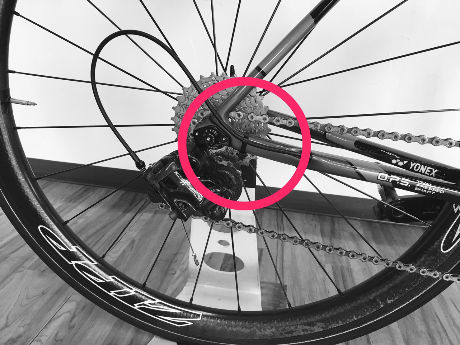 あまりデカールを貼ることはないが、チェーンステーにセラミックスピードのシールが貼ってある。