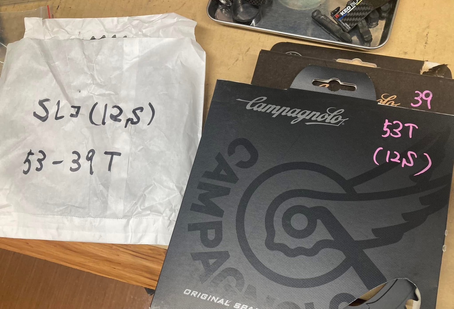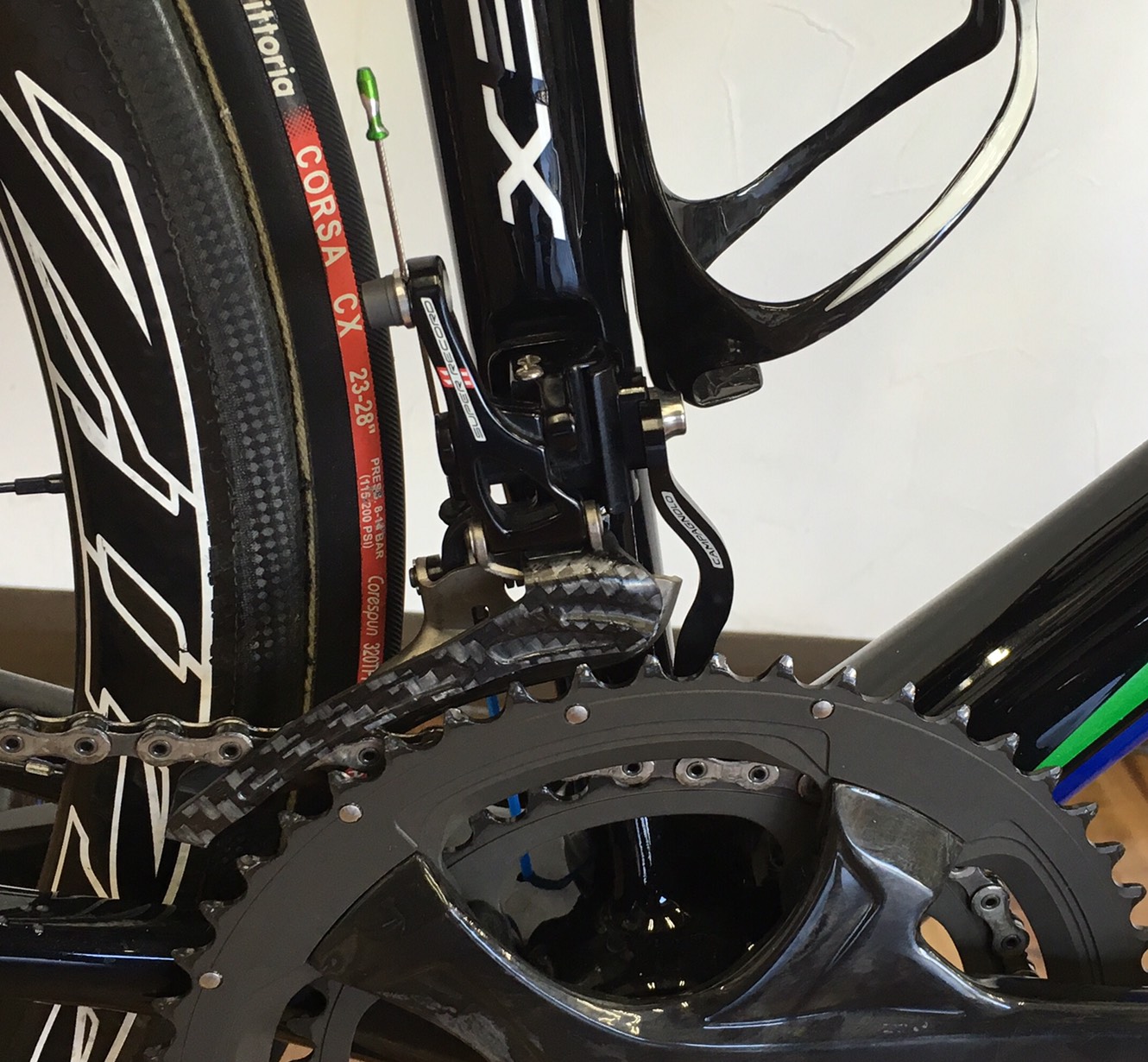 黒い方を組んだ時、無線専用のフレームに有線のカンパニョーロEPSを組み込んだ時は、「2度とやらない」と思いましたが、あっというまに2回目をやることになりました。