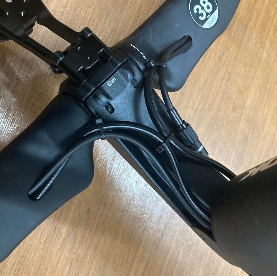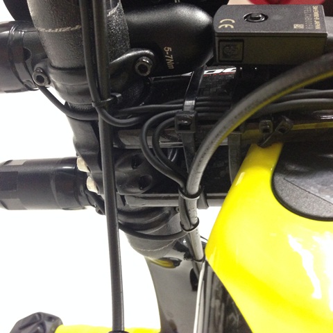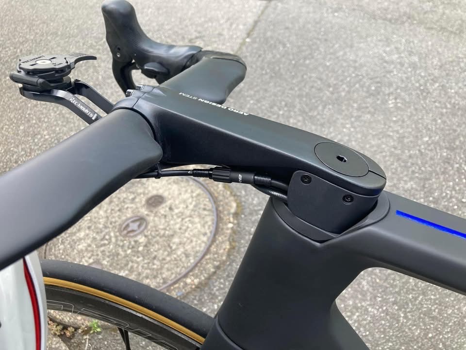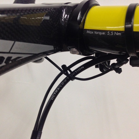Di2ケーブルの配線は全てステムの左側にまとめ、ダウンチューブに入っていく。